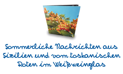 Der Sommer ist in der Speisekammer angekommen, die leichte, milde Brise bringt den Duft der neuen Jahrgänge sizilianischer Weine („Vermentino I.G.T.“ und „Passito I.G.T.“) und den des toskanischen „Birborosso“ mit sich, einem gekühlt zu trinkenden Rotwein.