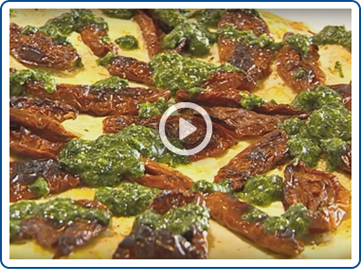 Das Rezept der Pizza mit getrockneten Tomaten und Pesto