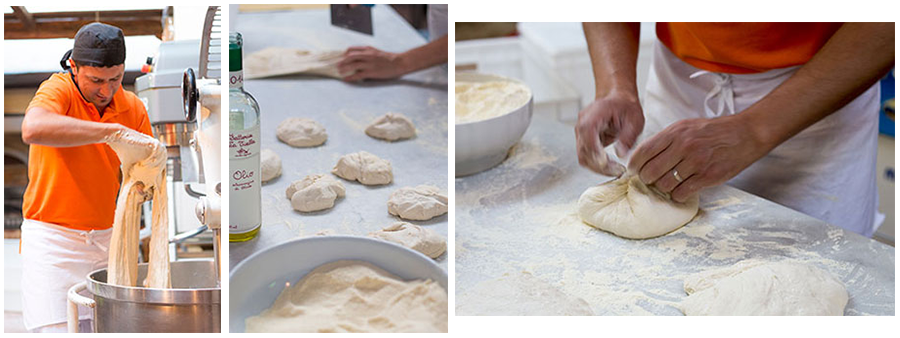 's Avonds voor het slapen gaan maakt u een klein, zeer zacht, deeg: in een kom mengt u 50g meel met het verkruimelde biergist en een scheut lauwwarm water (ten minste 37°C). Dek het af en laat het deeg op een lauwe plaats rijzen. De volgende ochtend stort u het resterende meel op een deegplank, in de vorm van een bergje met een kuil in het midden, waarin u het gerezen deeg legt. Met behulp van 180ml lauwwarm water (37°C) en 2 eetlepels olijfolie kneedt u alles totdat u een zacht en luchtig deeg heeft verkregen. Kneed dit deeg met de hand (rol het uit en kneed het weer bijeen, met kracht en meerdere malen).