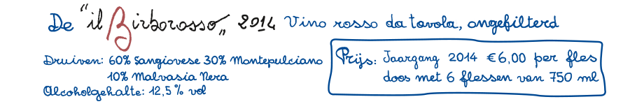 De ‘Birborosso’ (= de rode kwajongen) viert zijn eerste verjaardag! Het is een wijn in ‘rood gewaad’, die wordt gedronken als een witte wijn, dat is een ongebruikelijk recept. De structuur van de ultra-Toscaanse druivensoort Sangiovese is merkbaar, maar wordt verzacht door de metgezellen (de fruitige Montepulciano en de zachte geurige Malvasia) en