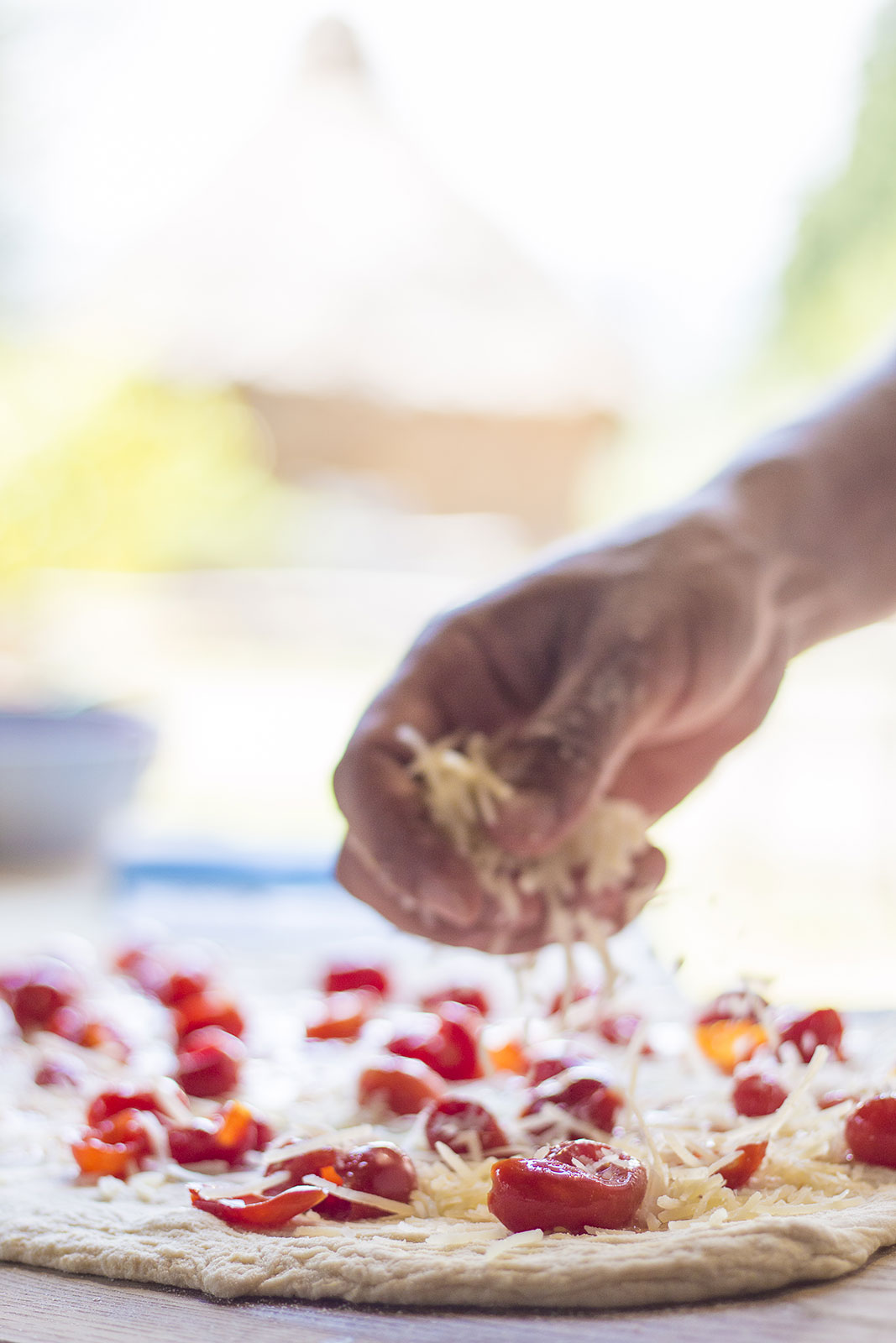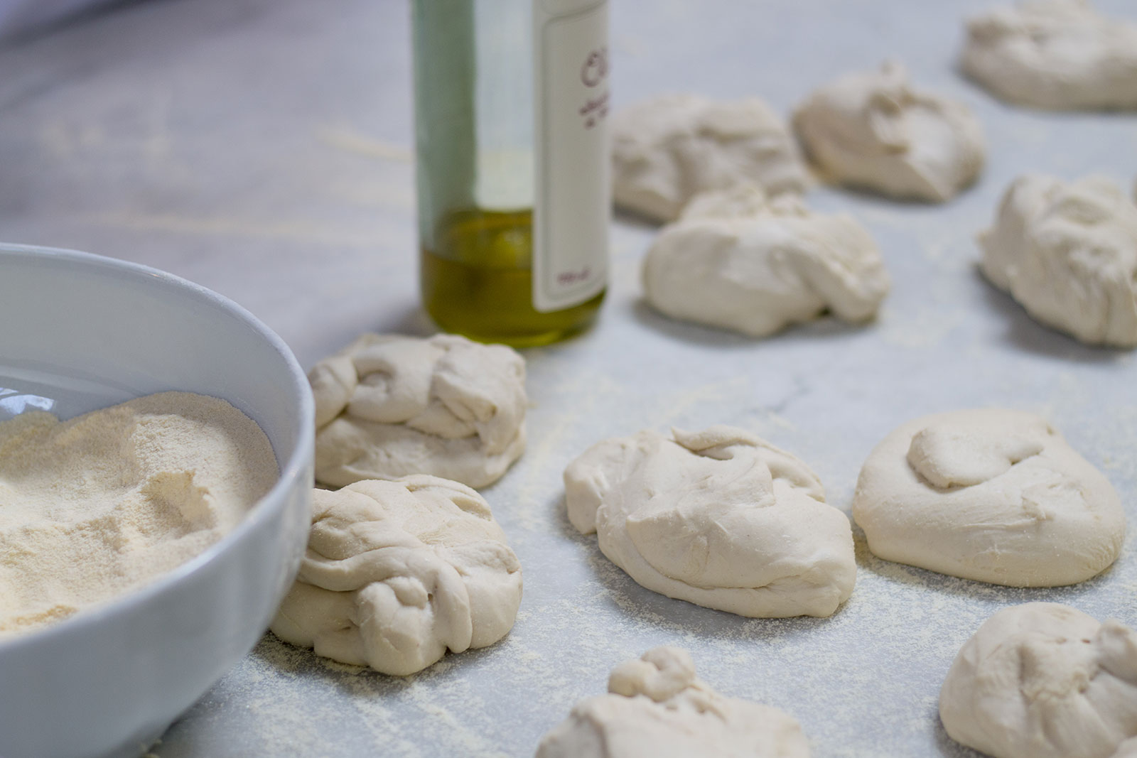 's Avonds voor het slapen gaan maakt u een klein, zeer zacht, deeg: in een kom mengt u 50g meel met het verkruimelde biergist en een scheut lauwwarm water (ten minste 37°C). Dek het af en laat het deeg op een lauwe plaats rijzen. De volgende ochtend stort u het resterende meel op een deegplank, in de vorm van een bergje met een kuil in het midden, waarin u het gerezen deeg legt. Met behulp van 180ml lauwwarm water (37°C) en 2 eetlepels olijfolie kneedt u alles totdat u een zacht en luchtig deeg heeft verkregen. Kneed dit deeg met de hand (rol het uit en kneed het weer bijeen, met kracht en meerdere malen).