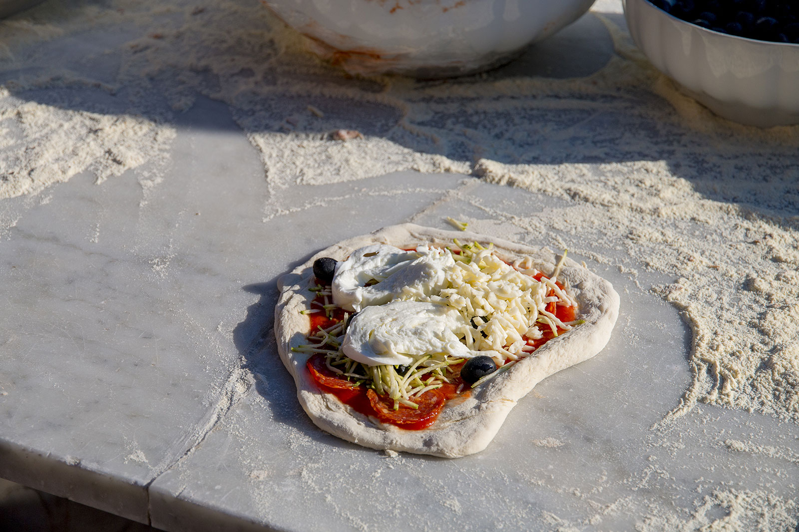 Het is een rustieke pizza, behoorlijk dik en stevig. Voldoende als antipasto, tussendoortje of voor het avondeten voor 3 à 4 personen. Dan kunt u er heel goed een salade of gekookte groente bij serveren.