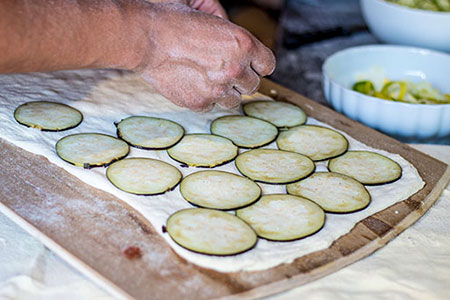 Wanneer het deeg zijn volume heeft verdubbeld, verwarmt u de oven voor op 200°C. Rol het deeg uit in een rechthoekige ovenschaal van zo’n 20 x 30cm. Verdeel hierover de aubergines en schenk daar 4 à 5 eetlepels olijfolie over. Plaats de schaal 20 minuten in de op 200°C voorverwarmde oven. Daarna haalt u de schaal uit de oven en verdeelt u de gesmoorde paddenstoeltjes en de verser ricotta erover, met behulp van een lepel.